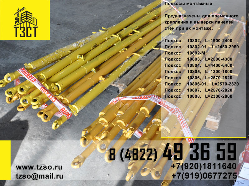 Монтажный подкос или крюк-крюк– это жесткая конструкция без собственных свойств устойчивости. Действует на линейное сжатие и используется для фиксирования элементов в установленной позиции. Это универсальное и распространенное приспособления для крепления невысоких колонн, элементов перегородки, панелей и прочих сборочных компонентов до финального проектного монтажа.Также применяется в каркасно-монолитных постройках.Несущие элементы производятся в соответствии с нормативами ГОСТ для соблюдения коэффициента стойкости.